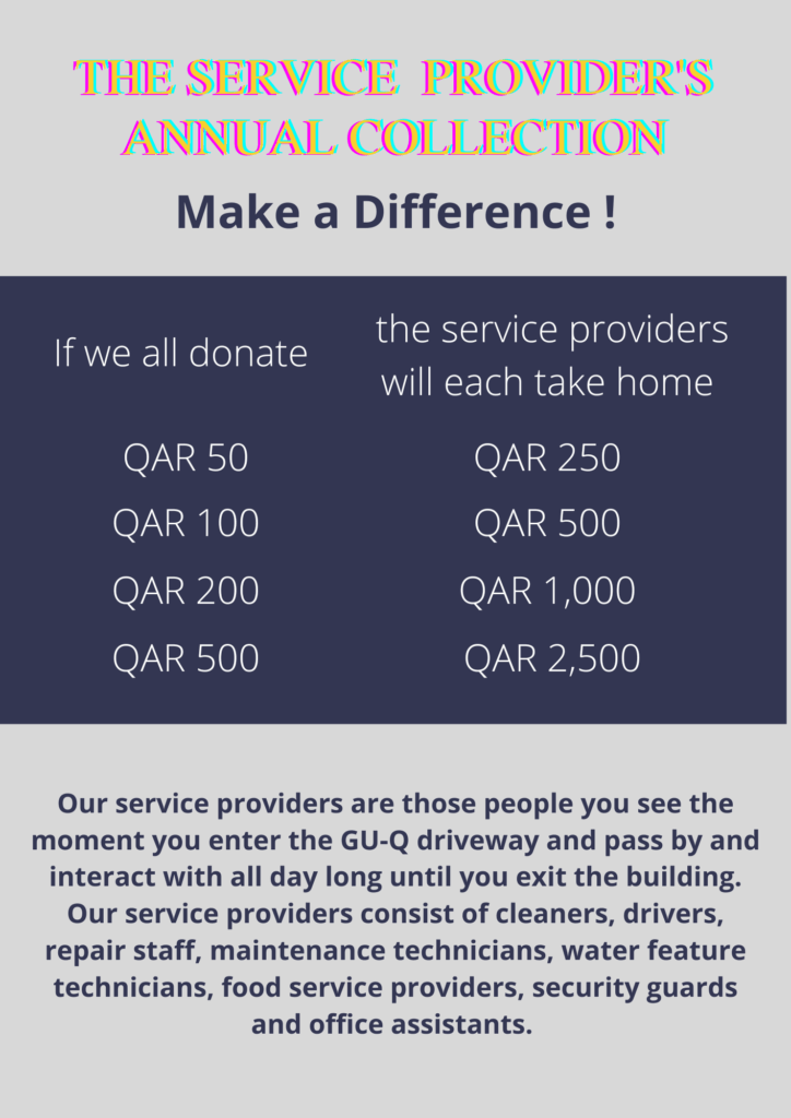 This is the last week to contribute to this year’s service provider’s collection. So far we have collected QAR 20,800. This will mean we can give each service provider QAR 200. It would be great to at least double that. Please give generously.