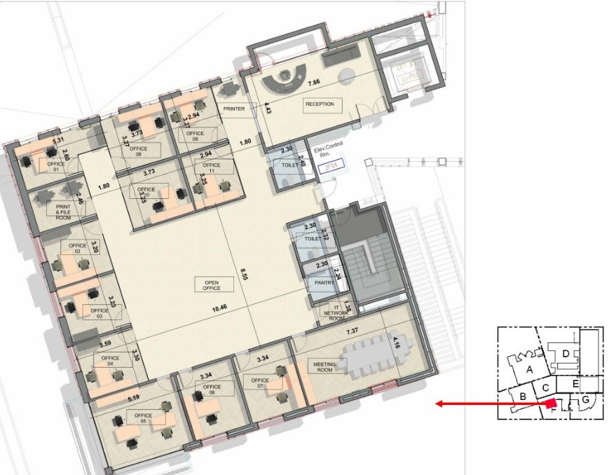 The fit-out will include complete mechanical, electrical, and plumbing systems. It will feature private offices, an open workspace area, restrooms, pantry, an IT network room, and will be fully furnished.