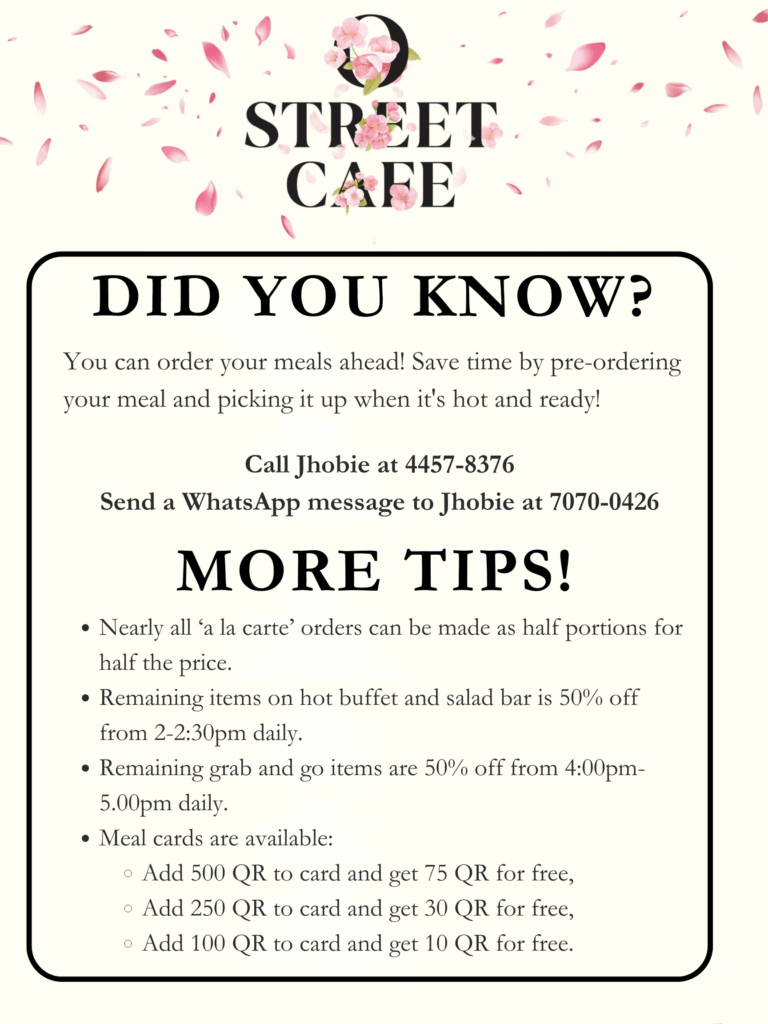 O Street Café: 8:00 am – 5:00 pm, Sunday – Thursday. O Street Cafe Buffet will be available from Sunday, 17th August.