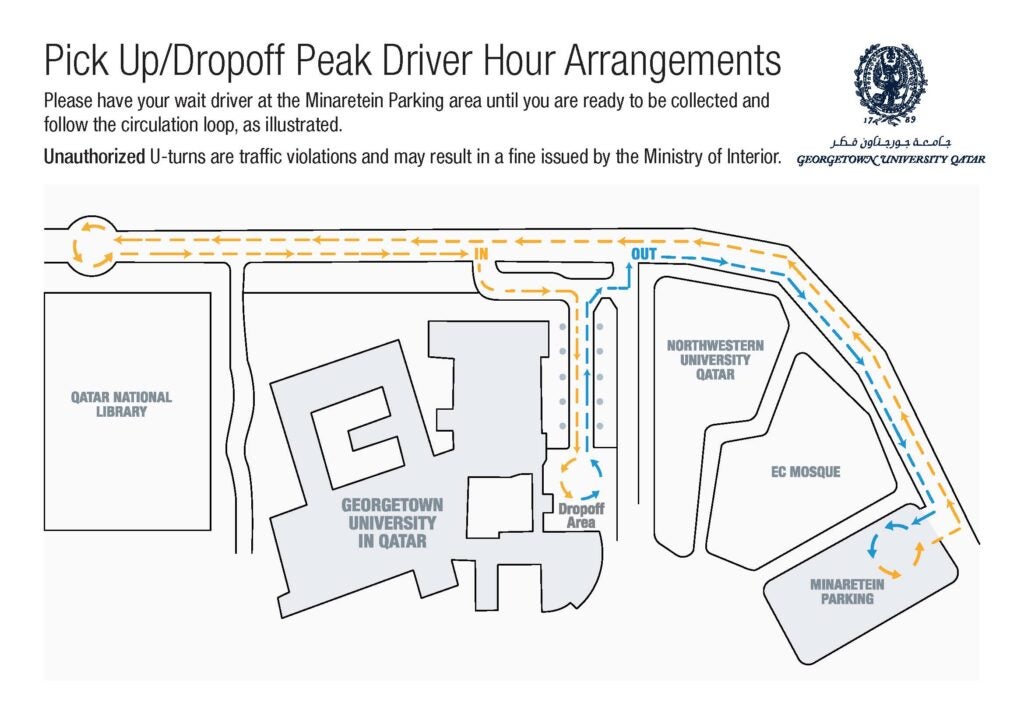 In conjunction with NU-Q we have implemented a Peak Hour traffic management scheme to try to alleviate traffic congestion during peak hours particularly between 3:30pm and 4pm. See details below.
